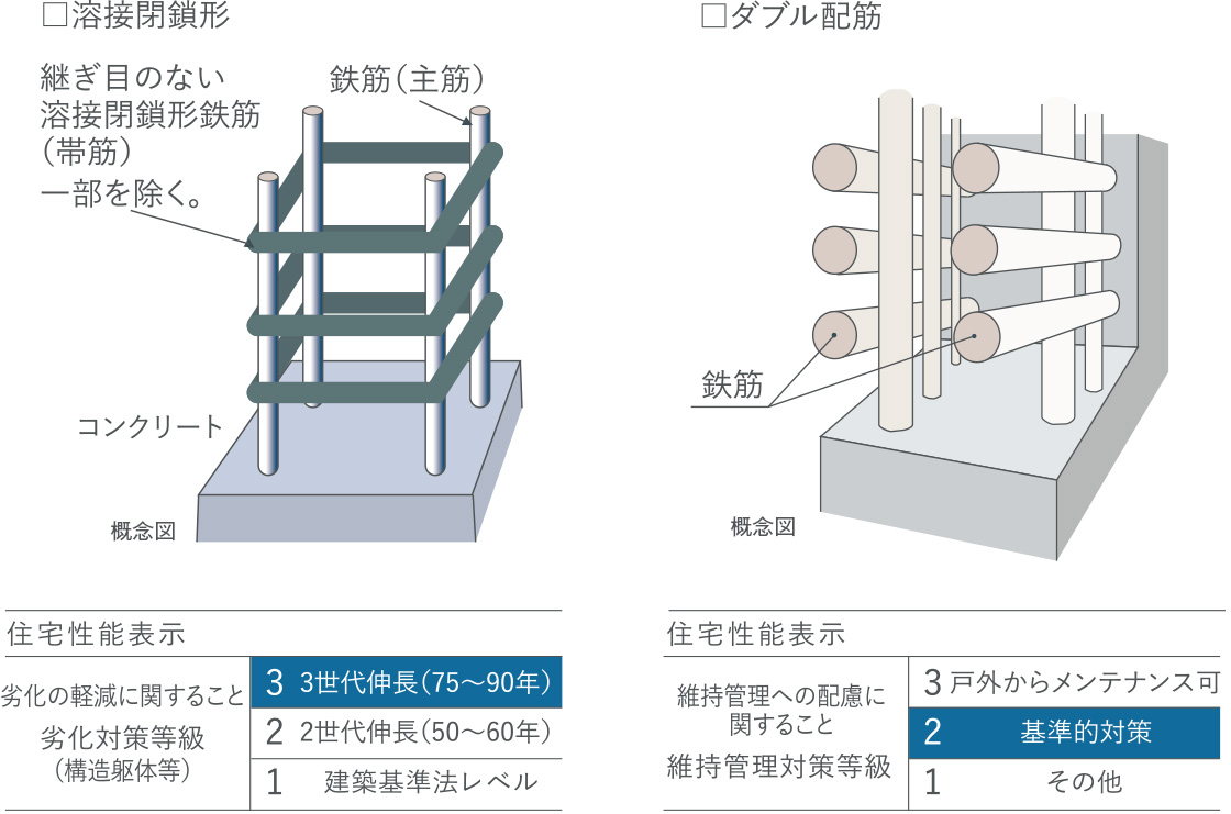 3世代住み継がれることを可能とするため、住棟の躯体はコンクリートに対する水の比率を50%以下にし、壁はコンクリートの中に二重に鉄筋を配したダブル配筋。柱部分は継ぎ目のない溶接閉鎖形帯筋を使用するなど、耐震・耐久性に優れた構造を追求しました。