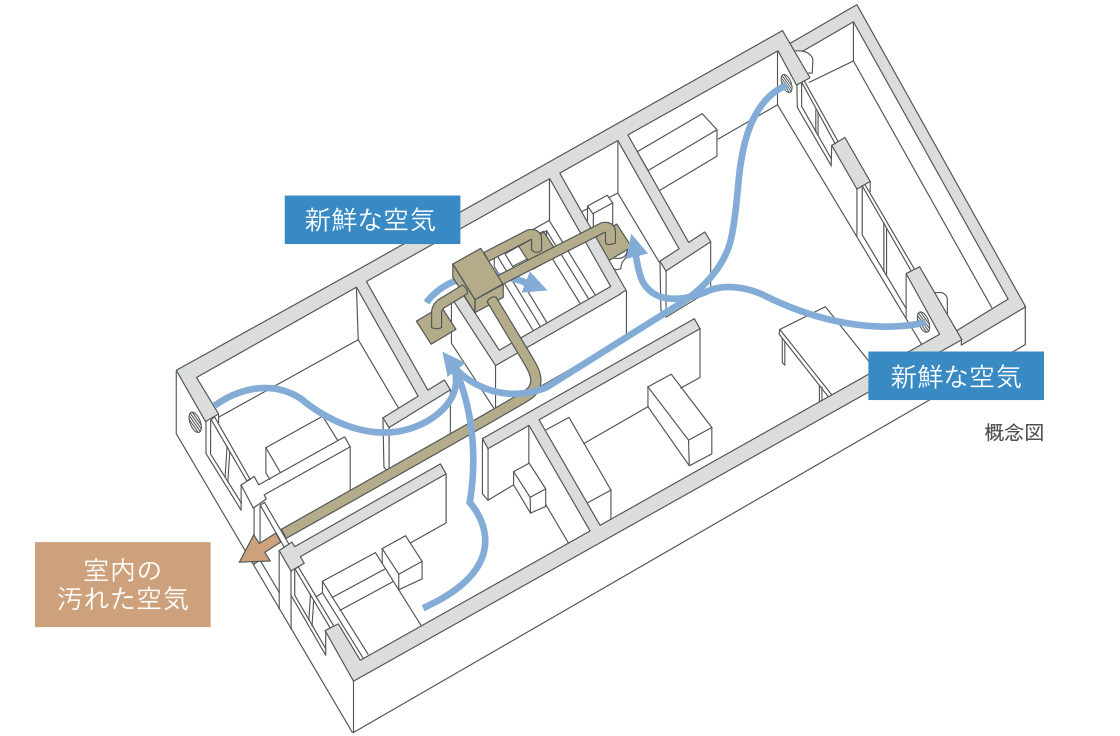 窓を閉めていても、室内に新鮮な空気を取り込む24時間換気システムを採用。新鮮な空気をたえず給気口から取り入れることで、空気の滞留がないため、湿気や匂いもこもりにくく快適です。