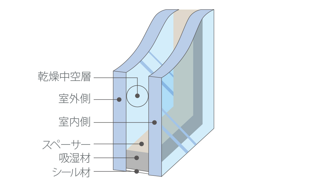 サッシには2枚のガラスで中間空気層を挟み込んだ複層ガラスを採用。中空層が断熱性を高くし、省エネ効果を発揮。