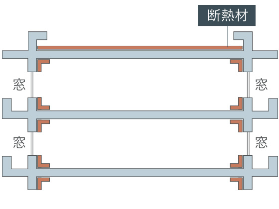 建物屋上には断熱材を内部ではなく外部に施工した外側断熱工法を採用。日中の外気温の影響を受けにくく快適な住環境を維持します。