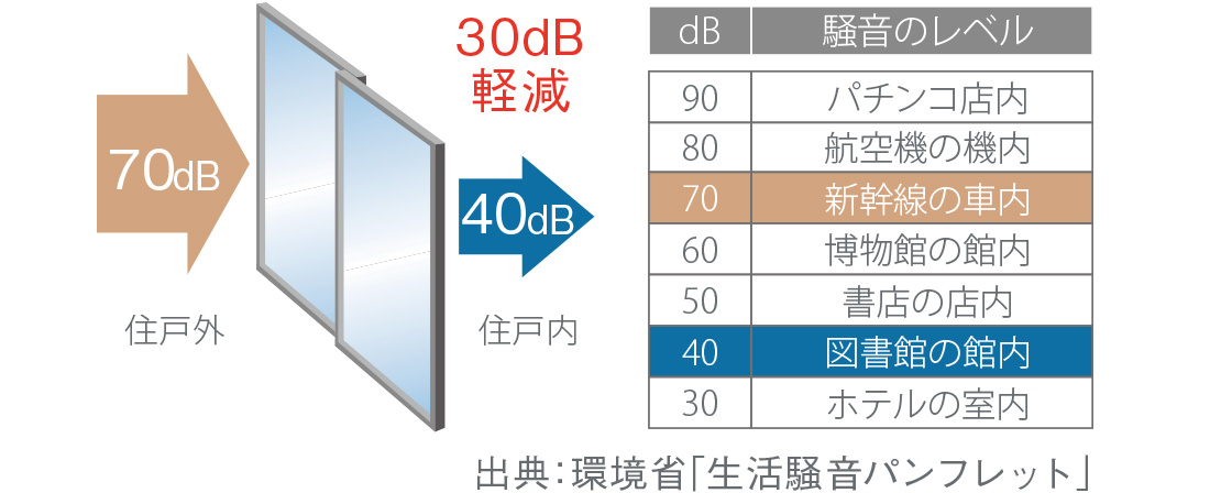 サッシには防音効果の高いT-2等級のサッシを採用。窓外からの騒音を軽減するだけではなく室内から外部への音漏れも軽減します。T-2等級とは、JIS(日本産業規格)に定める遮音等級を表し、約30dBの遮音性能があります。